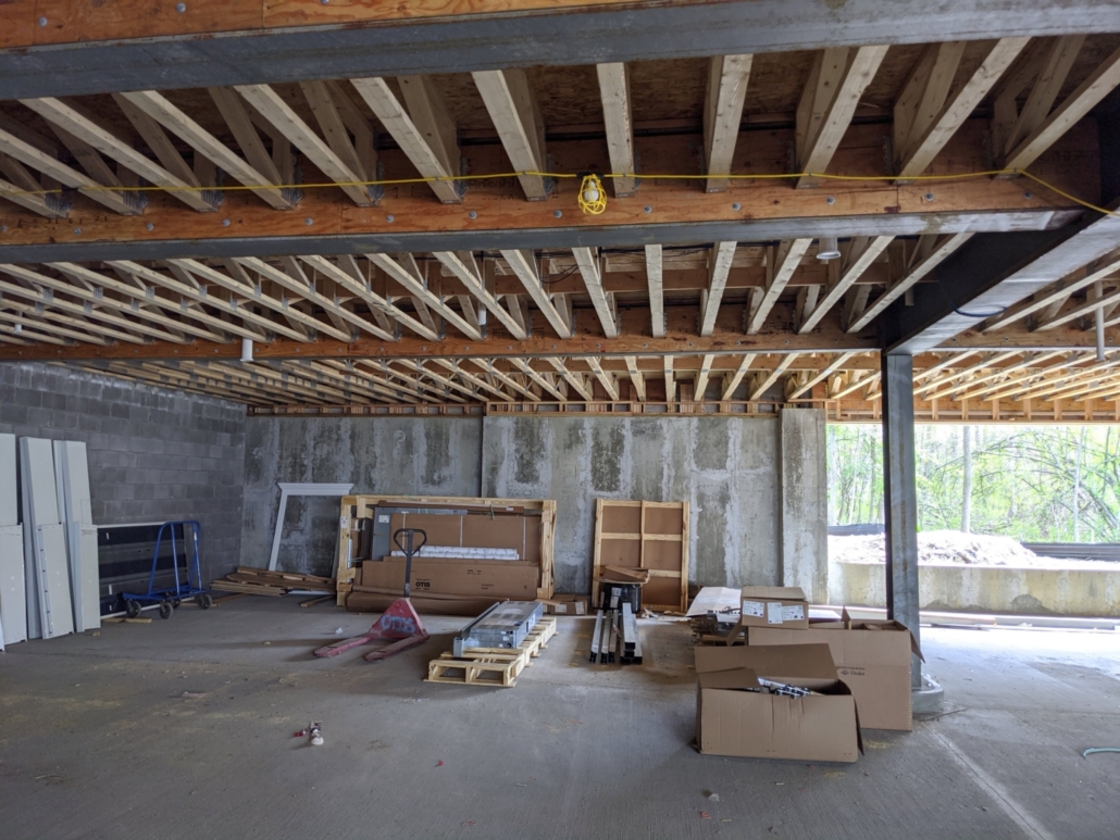 Inside of a building under construction, supporting columns and framing visible