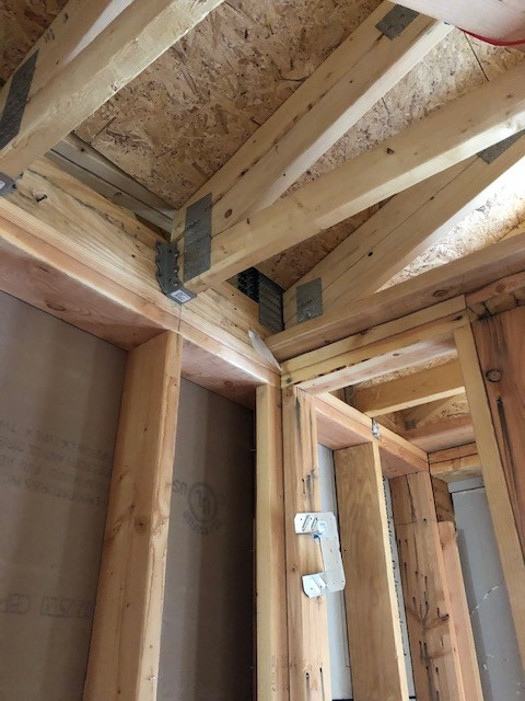 Framing of building showing joist hangars